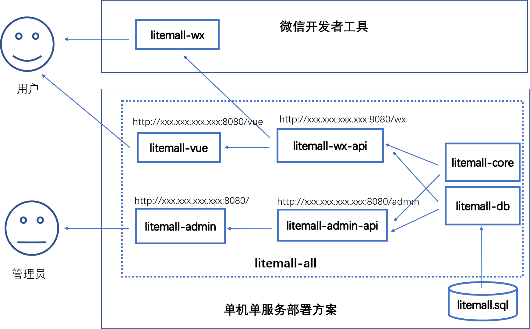由litemall-wx-api模块、litemall-wx模块和renard-wx模块组成;