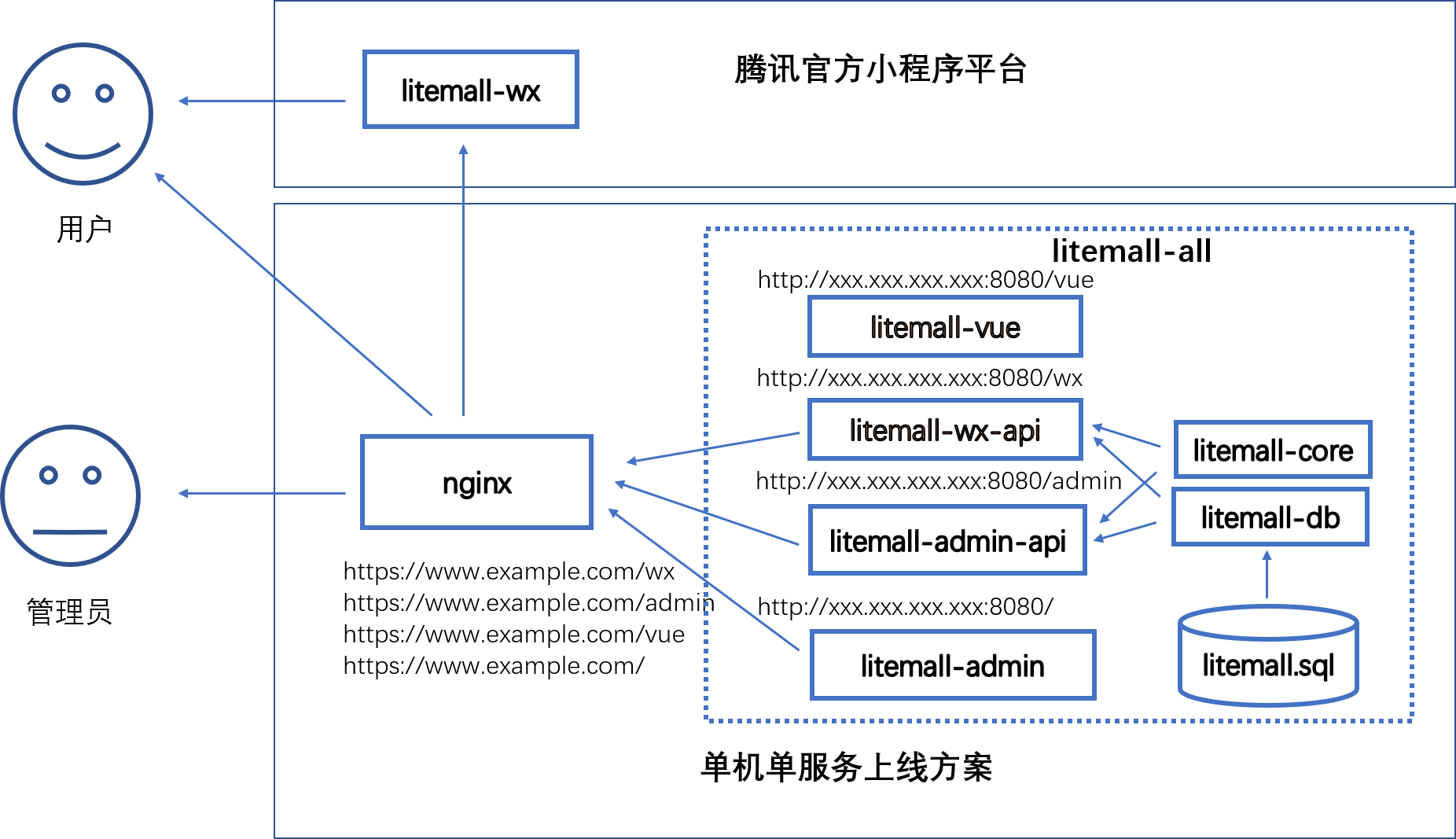 原来后端服务(包括小商城的后端服务和管理后台的后端服务)可以通过域名或者IP直接对外服务,而这里采用nginx反向代理后可以 通过80端口访问后端服务。因此,会存在这样一种结果: